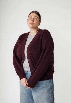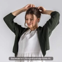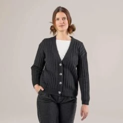 Leichter Cardigan aus Hanf und Bio-Baumwolle. Die vegane Damen-Strickjacke kommt mit eingerolltem Schalkragen und wird offen getragen.