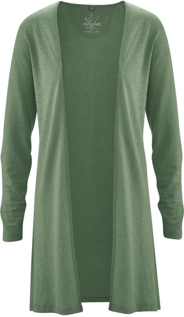 Langer Jersey-Cardigan aus 55% Hanf und 45% Bio-Baumwolle. Die vegane Damen Jacke wird offen getragen und ist durch die leichte Stoffqualität eine perfekte Ergänzung für jedes Sommer-Outfit.