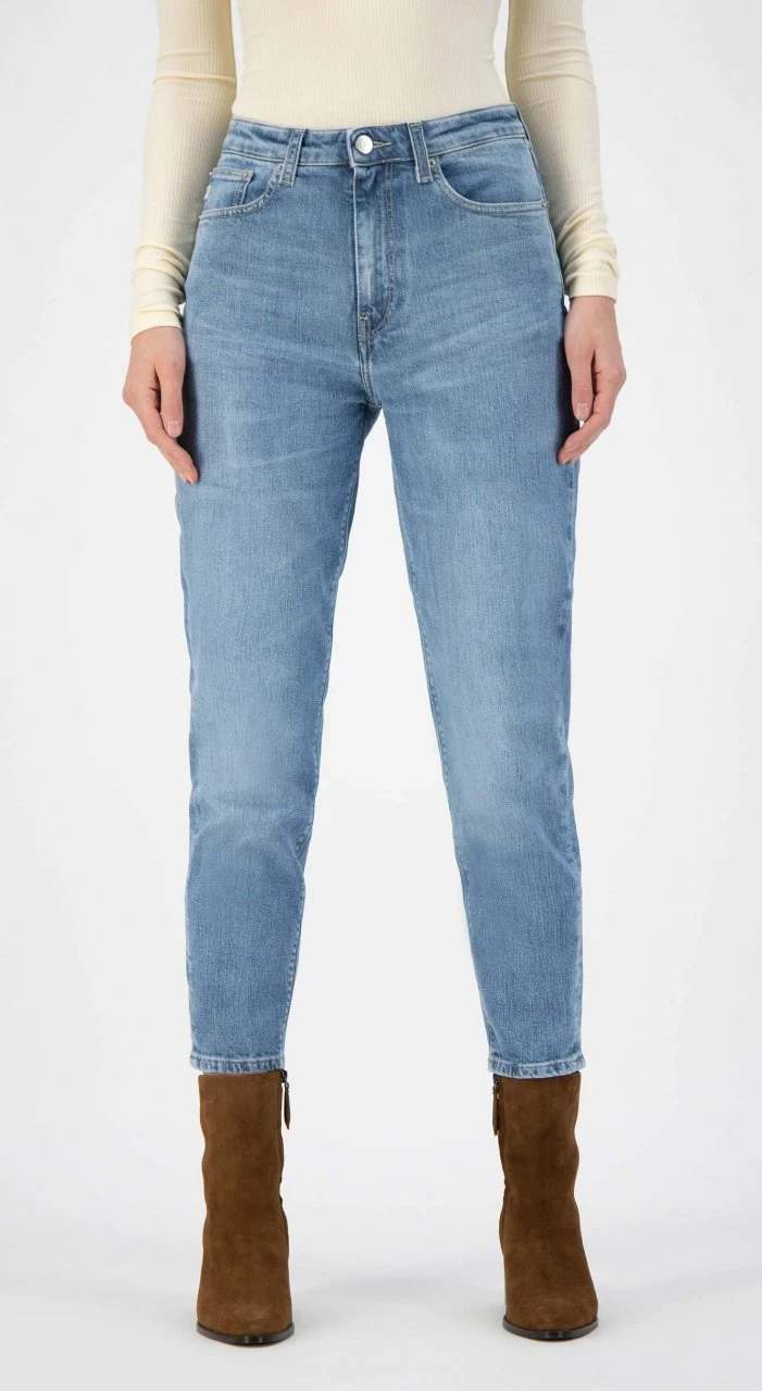 Locker geschnittene Jeans mit besonders hoher Leibhöhe. Die Beine sind zulaufend und knöchelfrei. Die 5-Pocket Hose kommt mit einem aufgedruckten Logo auf der Rückseite sowie dezenten, silberfarbenen Nieten. Geschlossen wird diese Jeans mit einem Knopf und Reißverschluss.