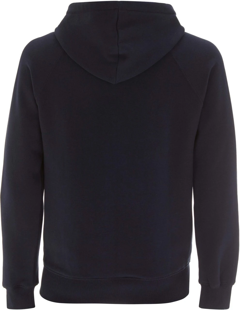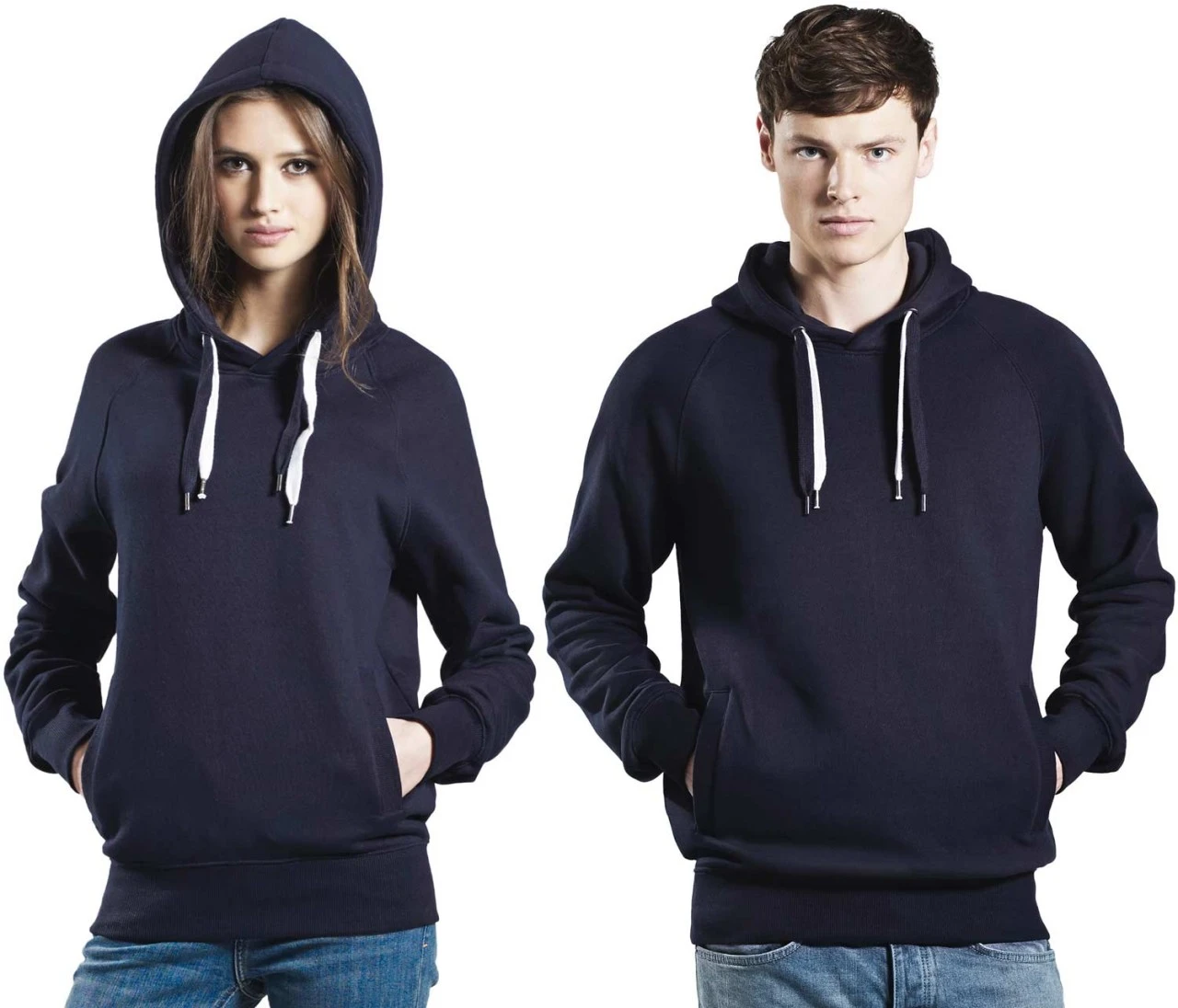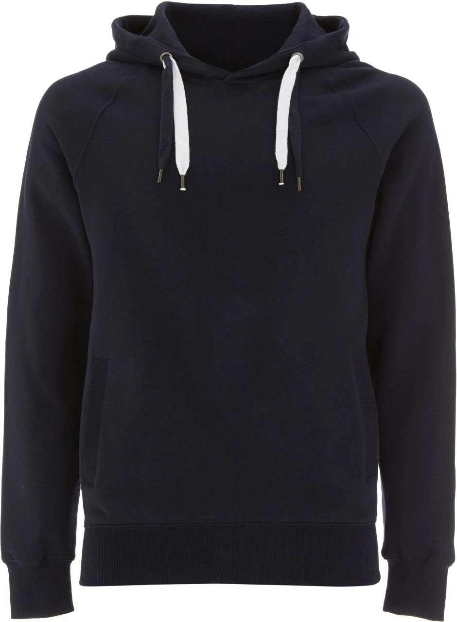 Dunkelblauer Raglan Kapuzenpullover aus Bio-Baumwolle. Ohne Motivdruck oder Logo-Applikation und im komplett einfarbigen Design: ein fair hergestellter Basic-Hoodie, der sich vielseitig kombinieren lässt.