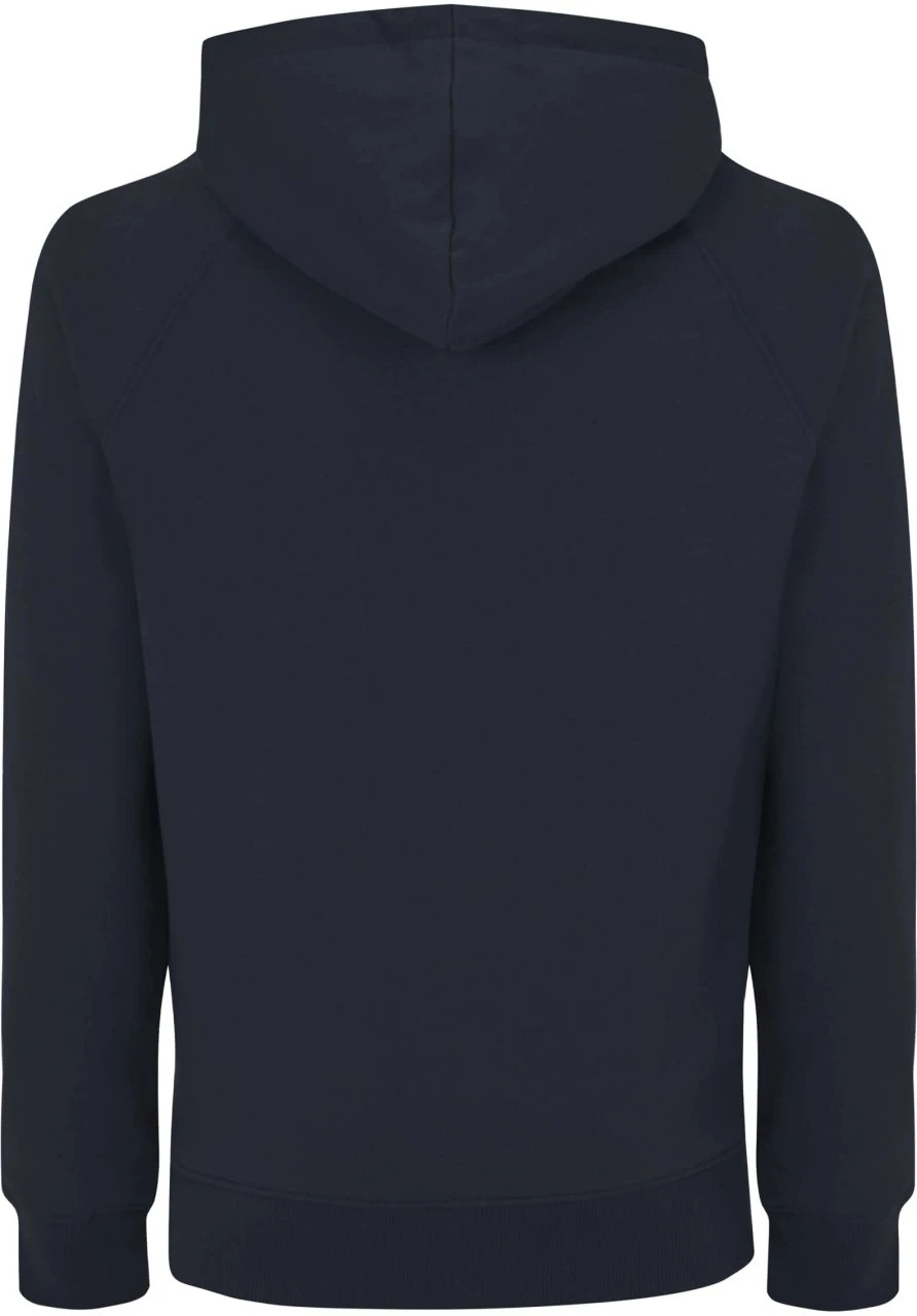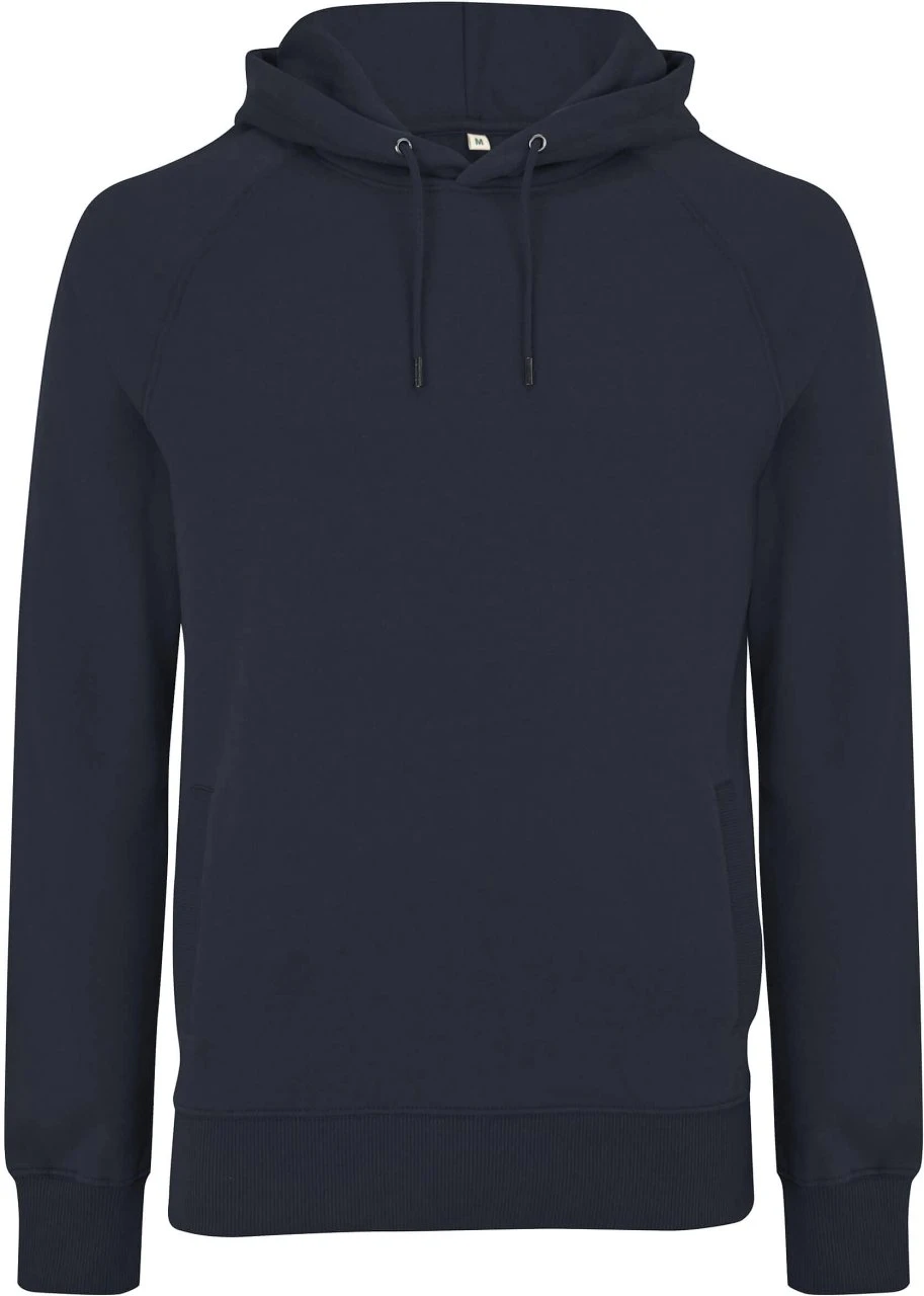 Basic Kapuzenpullover aus Bio-Baumwolle. Der navyblaue Raglan-Hoodie ist mit seinem höheren Stoffgewicht und der kuschelig aufgerauten Innenseite ein echtes Wohlfühl-Textil für den Herbst und Winter.