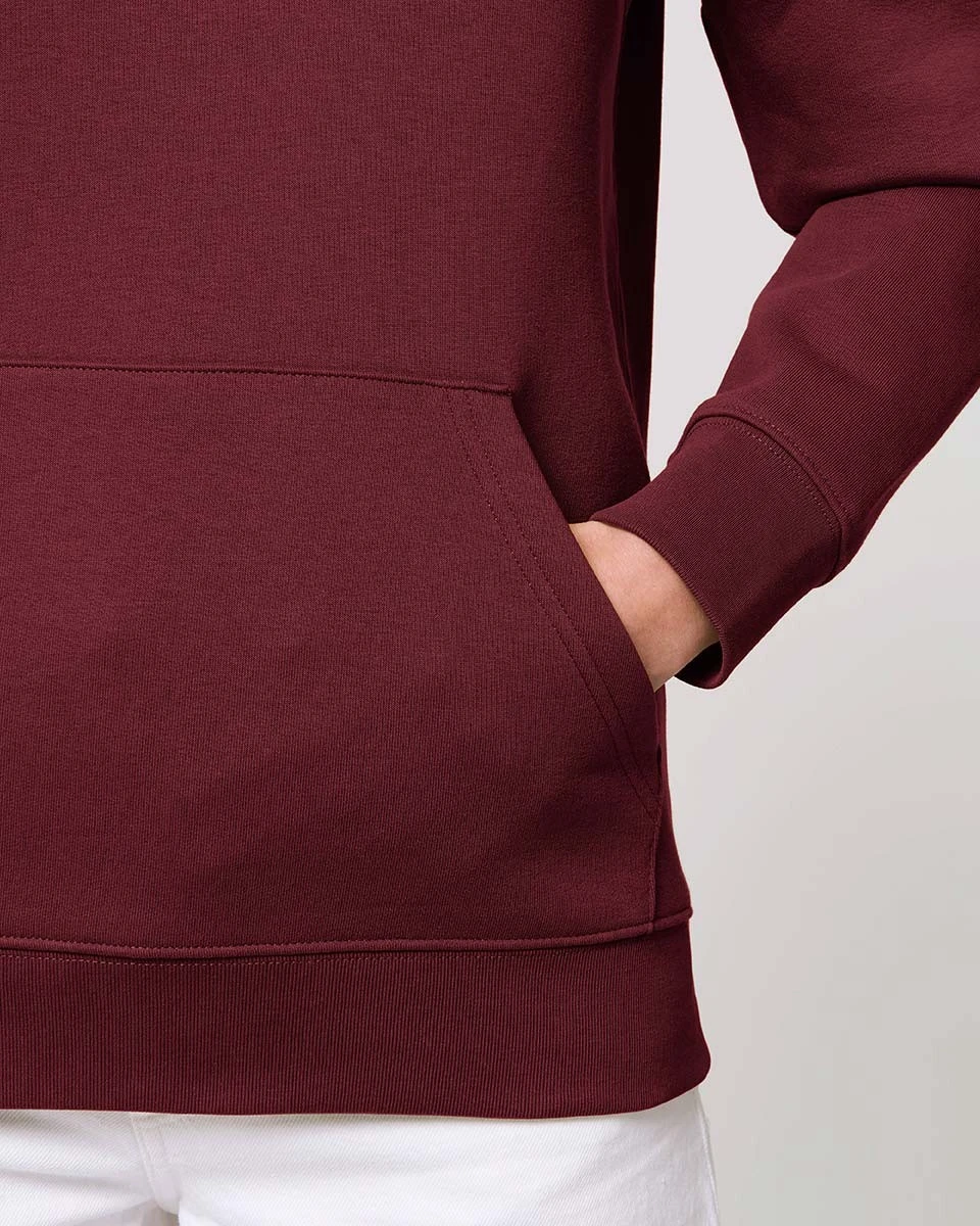 Hochwertiger, klassisch geschnittener Unisex Hoodie aus Bio-Baumwolle und 15% recyceltem Polyester. Der Kapuzenpullover kommt mit eingesetzten Ärmeln und einer großen Kängurutasche. Die Kapuze ist doppellagig und hat einen Tunnelzug mit gleichfarbigen Kordeln. Die Kordelabschlüsse und -ösen bestehen aus Metall. Hüft- und Ärmelabschlüsse sind mit breiten Rippbündchen eingefasst. Der Stoff ist schwer, weich und sorgt für ein komfortables Tragegefühl. Die Innenseite ist aufgeraut und liegt angenehm weich auf der Haut.