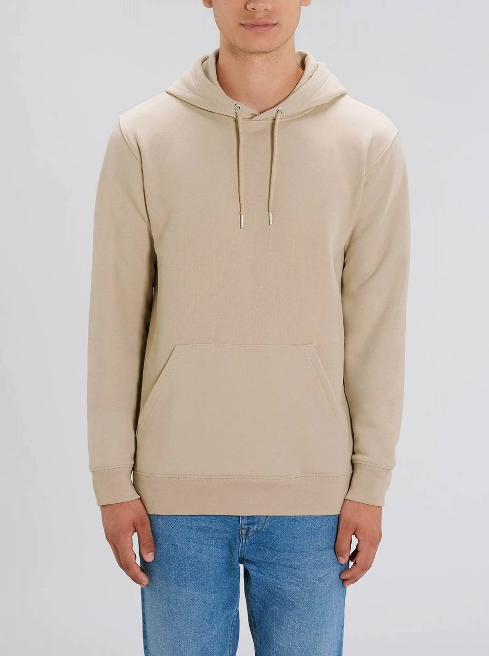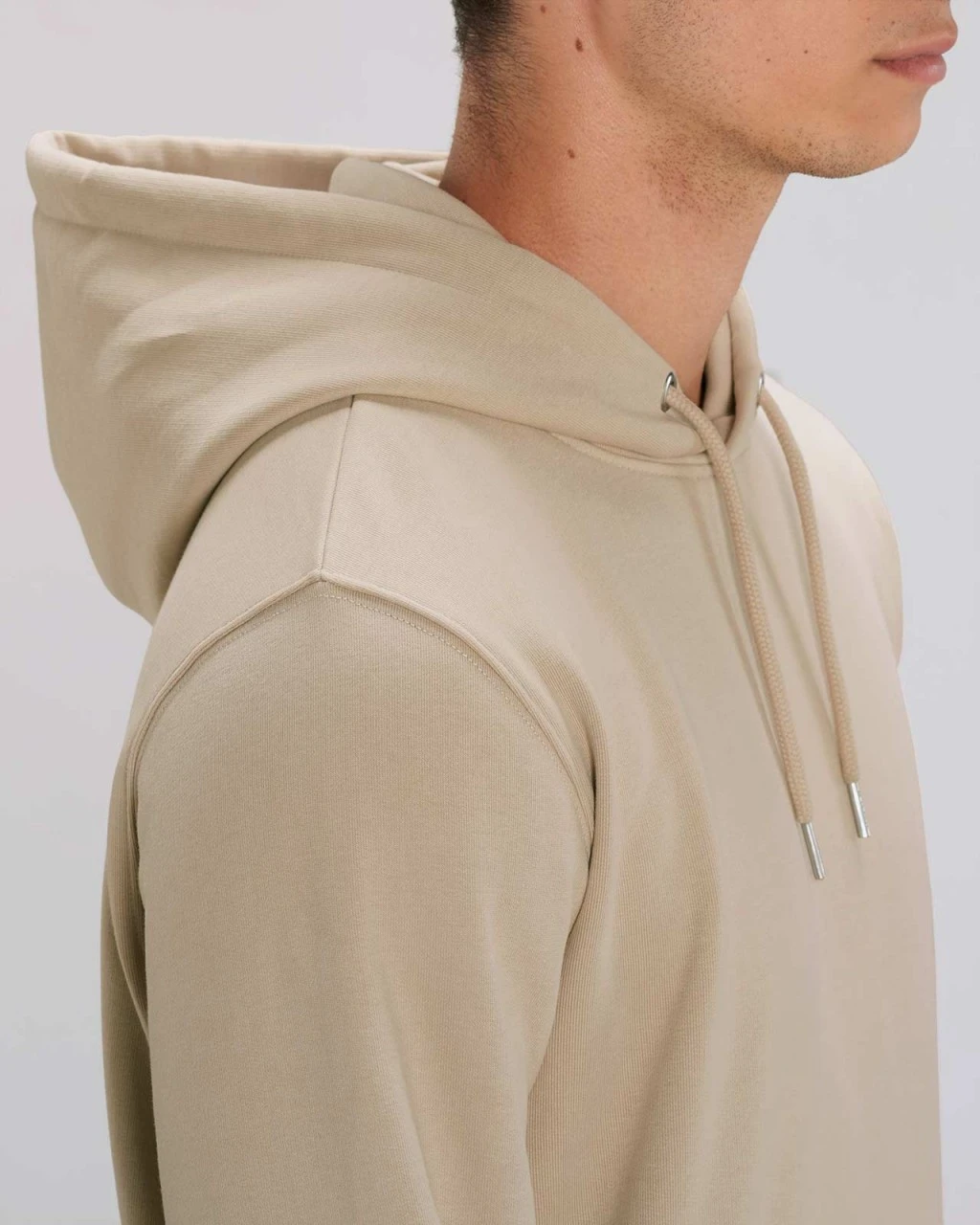 Hochwertiger, klassisch geschnittener Unisex Hoodie aus Bio-Baumwolle und 15% recyceltem Polyester. Der Kapuzenpullover kommt mit eingesetzten Ärmeln und einer großen Kängurutasche. Die Kapuze ist doppellagig und hat einen Tunnelzug mit gleichfarbigen Kordeln. Die Kordelabschlüsse und -ösen bestehen aus Metall. Hüft- und Ärmelabschlüsse sind mit breiten Rippbündchen eingefasst. Der Stoff ist schwer, weich und sorgt für ein komfortables Tragegefühl. Die Innenseite ist aufgeraut und liegt angenehm weich auf der Haut.