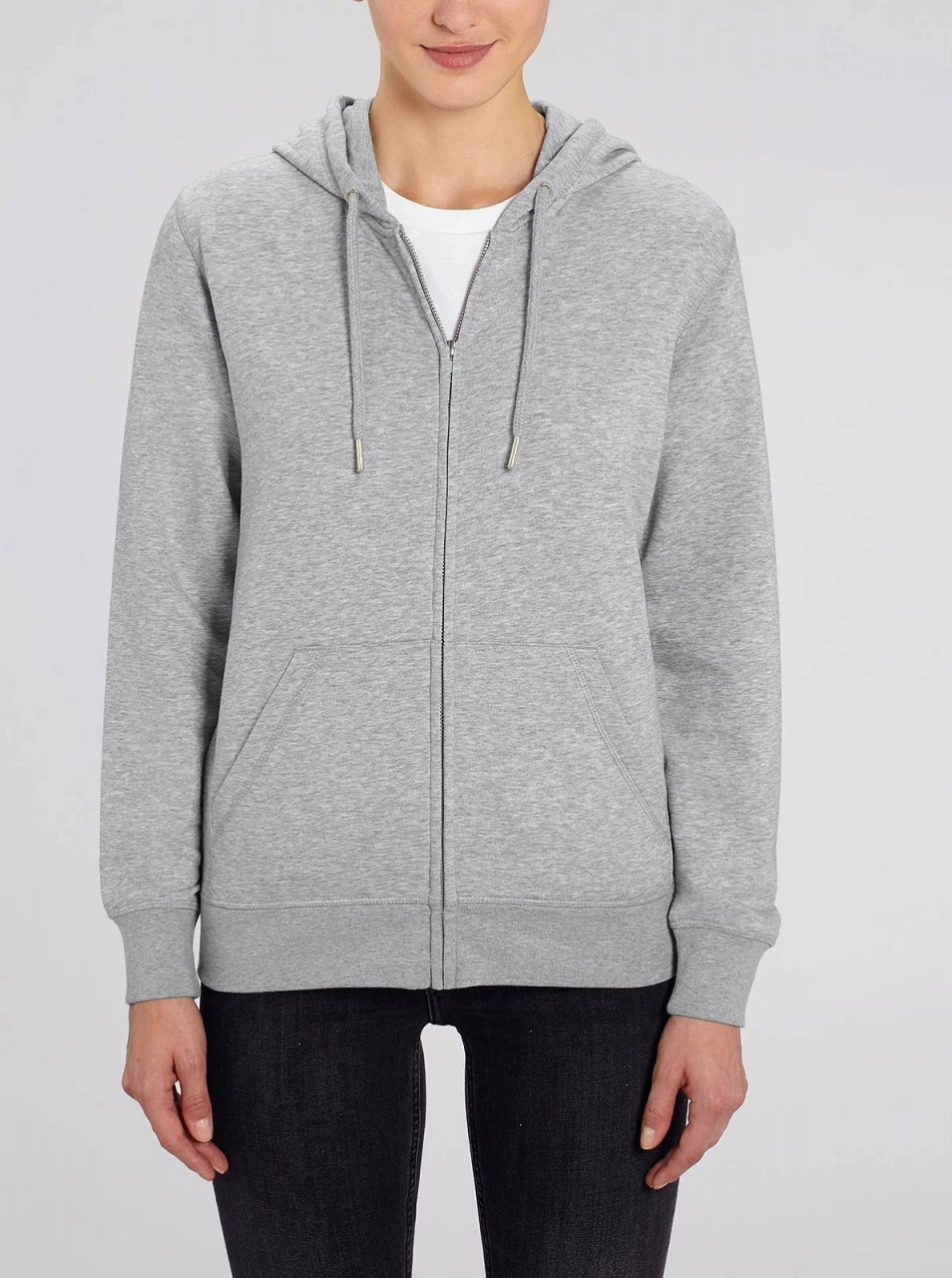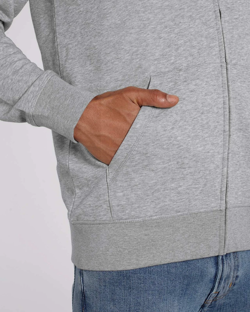 Hochwertige, klassisch geschnittene Unisex Kapuzenjacke aus Bio-Baumwolle und 15% recyceltem Polyester. Die Zip-Jacke kommt mit eingesetzten Ärmeln und großer Kängurutasche. Der Reißverschluss ist verdeckt und kaum sichtbar, wenn die Jacke geschlossen ist. Die Kapuze ist mit weichem Jersey-Stoff ausgekleidet und hat einen Tunnelzug mit gleichfarbigen Kordeln. Die Kordelabschlüsse und -ösen bestehen aus Metall. Hüft- und Ärmelabschlüsse sind mit breiten Rippbündchen eingefasst. Der Stoff ist dick, weich und sorgt für ein komfortables Tragegefühl. Die Innenseite besteht aus French Terry Stoff und liegt angenehm auf der Haut.