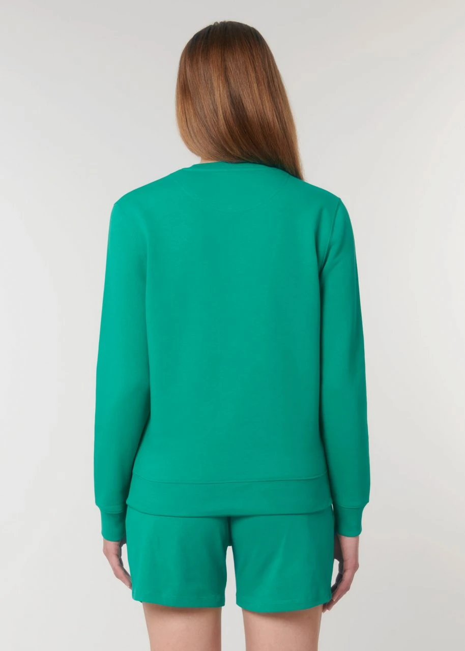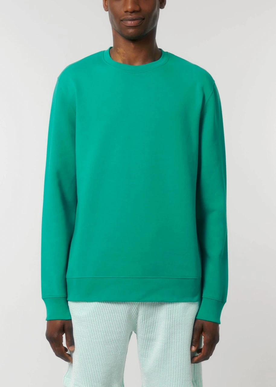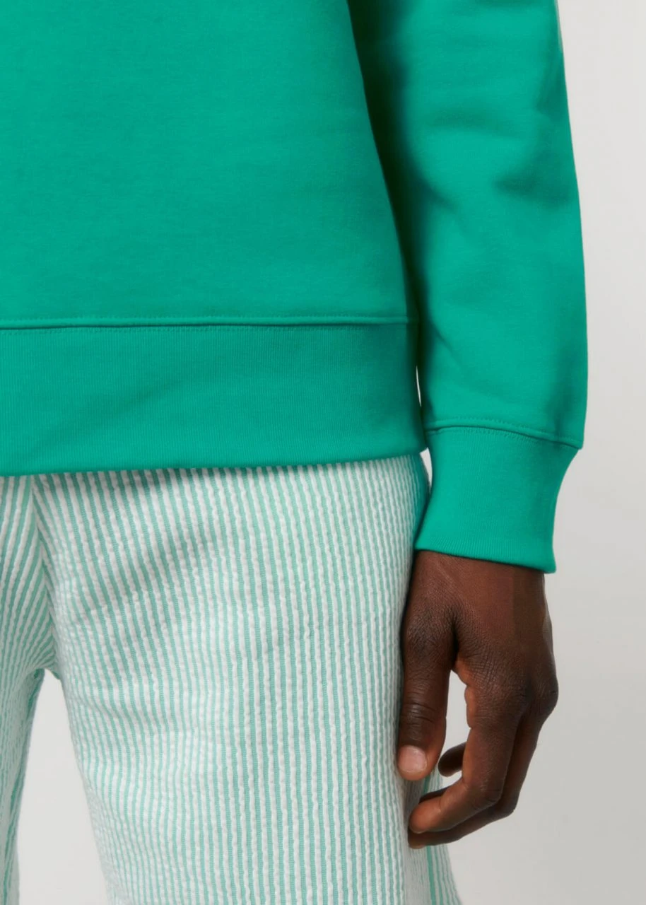 Klassisch geschnittenes Unisex Sweatshirt aus Bio-Baumwolle und 15% recyceltem Polyester. Der Sweater kommt mit eingesetzten Ärmeln. Hüft, Hals- und Ärmelabschlüsse sind mit einem feinen Rippbündchen eingefasst. Der Stoff ist schwer, weich und sorgt für ein komfortables Tragegefühl. Die Innenseite ist aufgeraut und liegt angenehm weich auf der Haut.