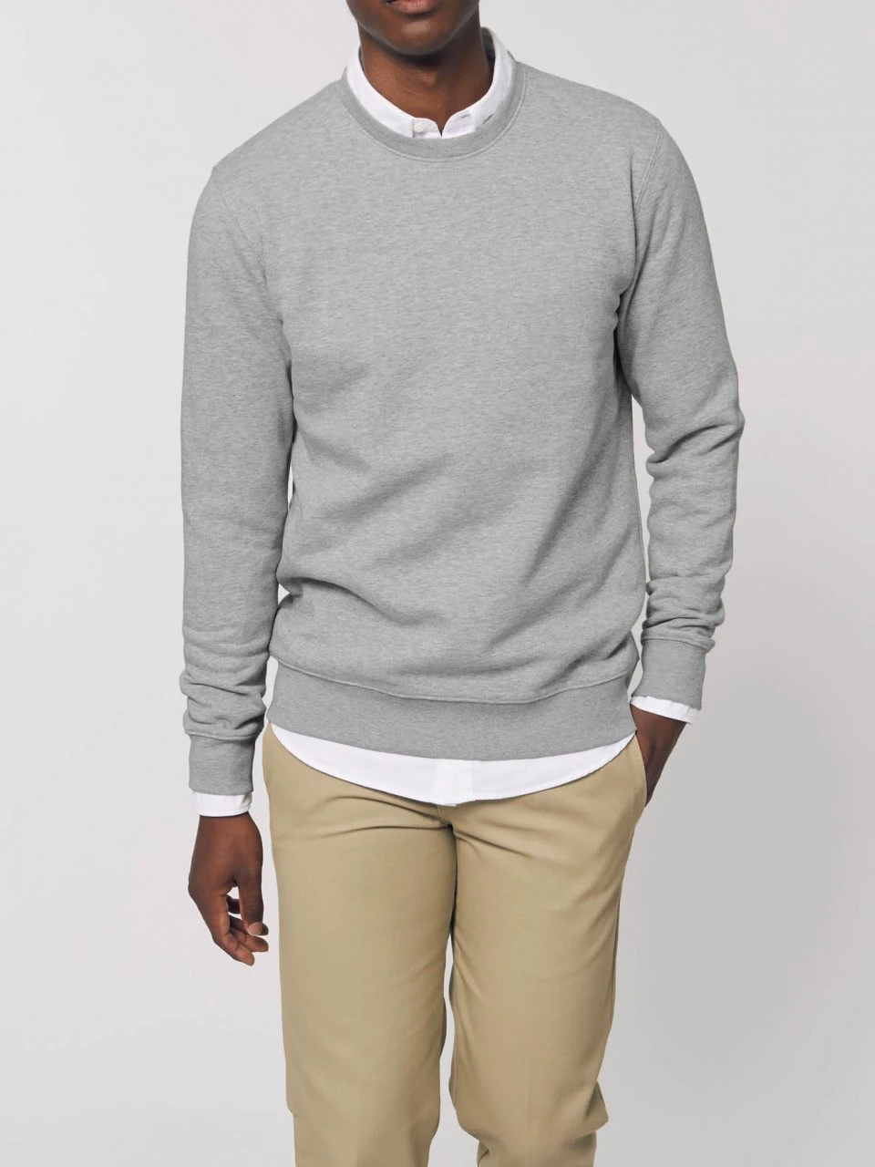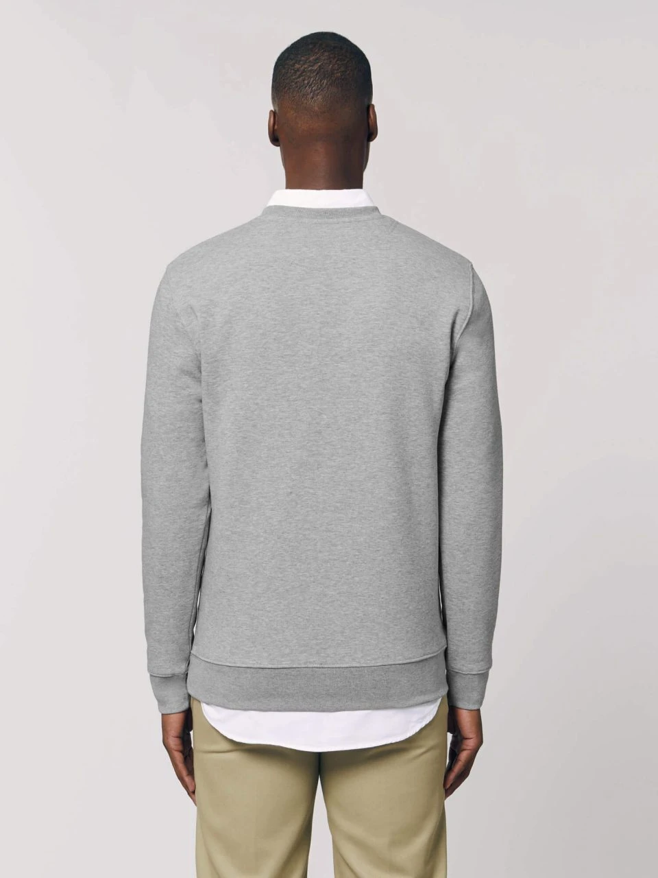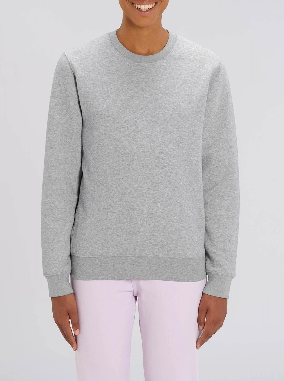 Klassisch geschnittenes Unisex Sweatshirt aus Bio-Baumwolle und 15% recyceltem Polyester. Der Sweater kommt mit eingesetzten Ärmeln. Hüft, Hals- und Ärmelabschlüsse sind mit einem feinen Rippbündchen eingefasst. Der Stoff ist schwer, weich und sorgt für ein komfortables Tragegefühl. Die Innenseite ist aufgeraut und liegt angenehm weich auf der Haut.